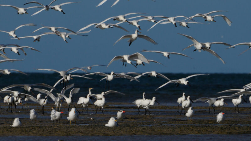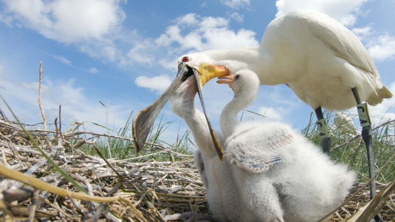 Les spatules sont des échassiers blancs facilement identifiables grâce à leur bec en forme de cuillère. Leur préservation est un grand succès.